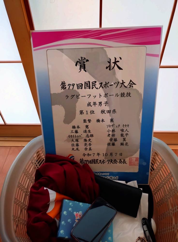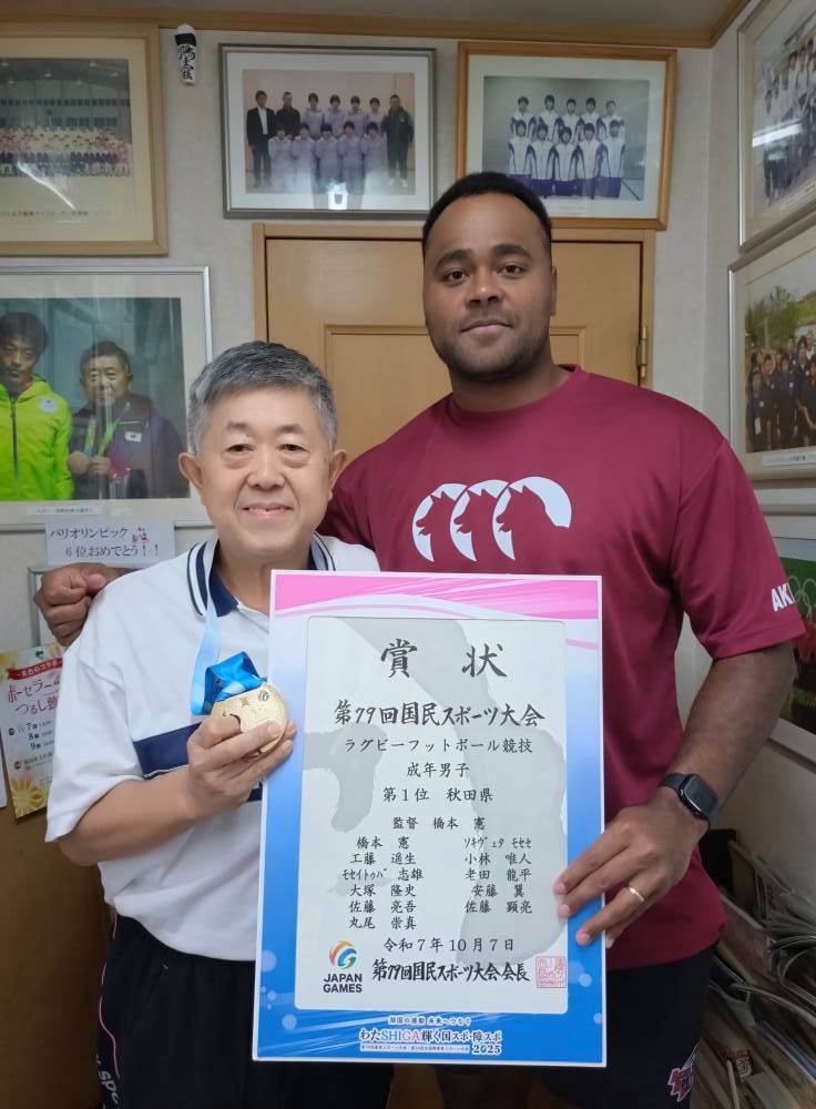 滋賀国民スポーツ大会の成年ラグビーで優勝したメンバーのモセセ選手が優勝の報告に来てくれました。